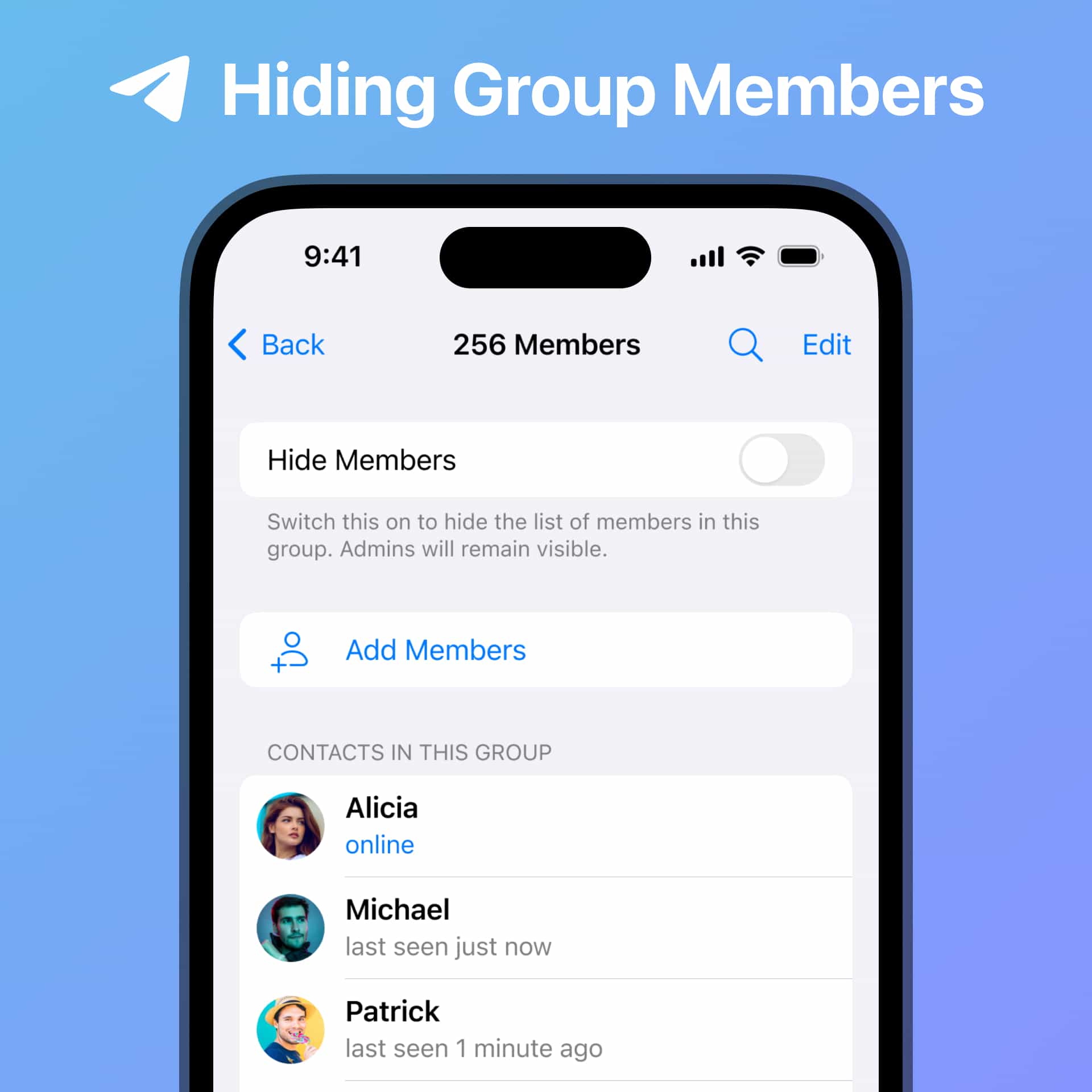 Les administrateurs des groupes de 100+ membres peuvent désormais choisir de cacher la liste des membres. De cette façon, si les gens n'envoient pas de messages dans le groupe, seuls ses administrateurs sauront qu'ils sont membres du groupe.