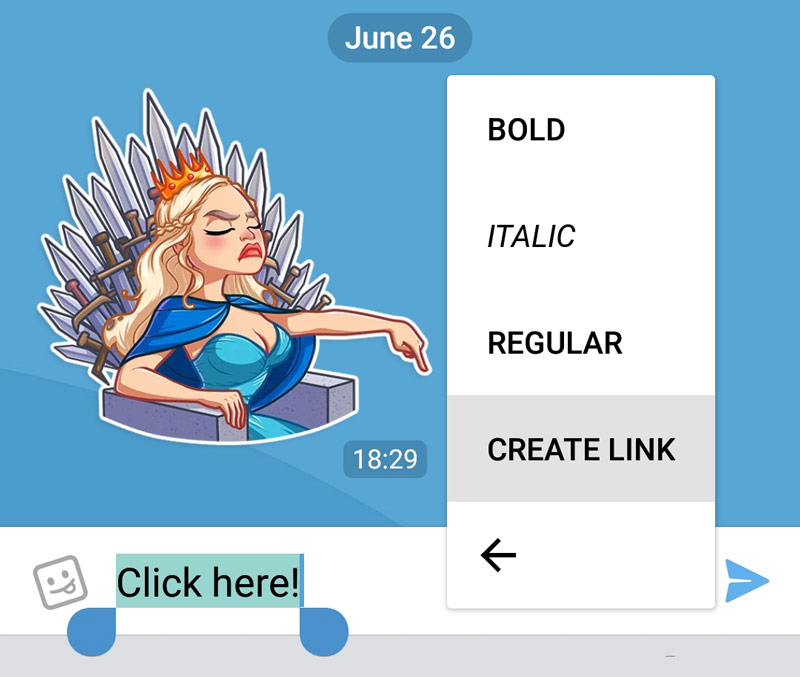 Use the “create link” option in the formatting menu to make text URLs: