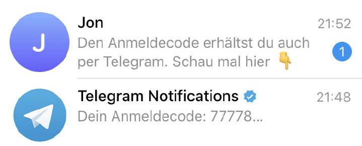 Wenn du kurz zuvor Telegram auf einem anderen Gerät benutzt hast, können wir dir den Anmeldecode per Telegram anstelle von SMS senden. Um einen solchen Code zu erhalten, schau einfach nach der Chatnachricht von Telegram. Diese erkennst du an einem verifizierten Profil mit einem blauen Haken: