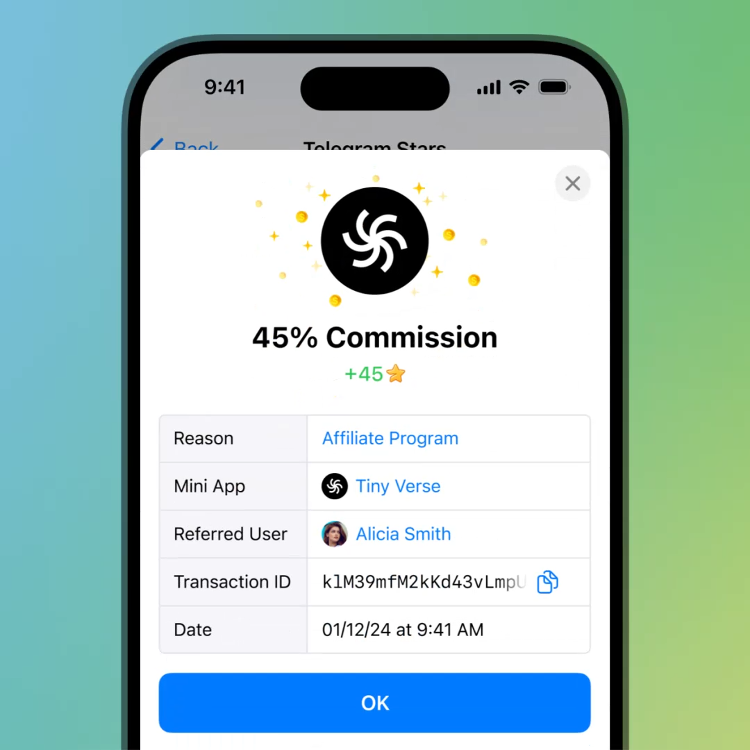 Developers are able to open affiliate programs for their mini app – allowing content creators, other mini app developers and any Telegram user to promote it and earn commissions on purchases made by people they referred.