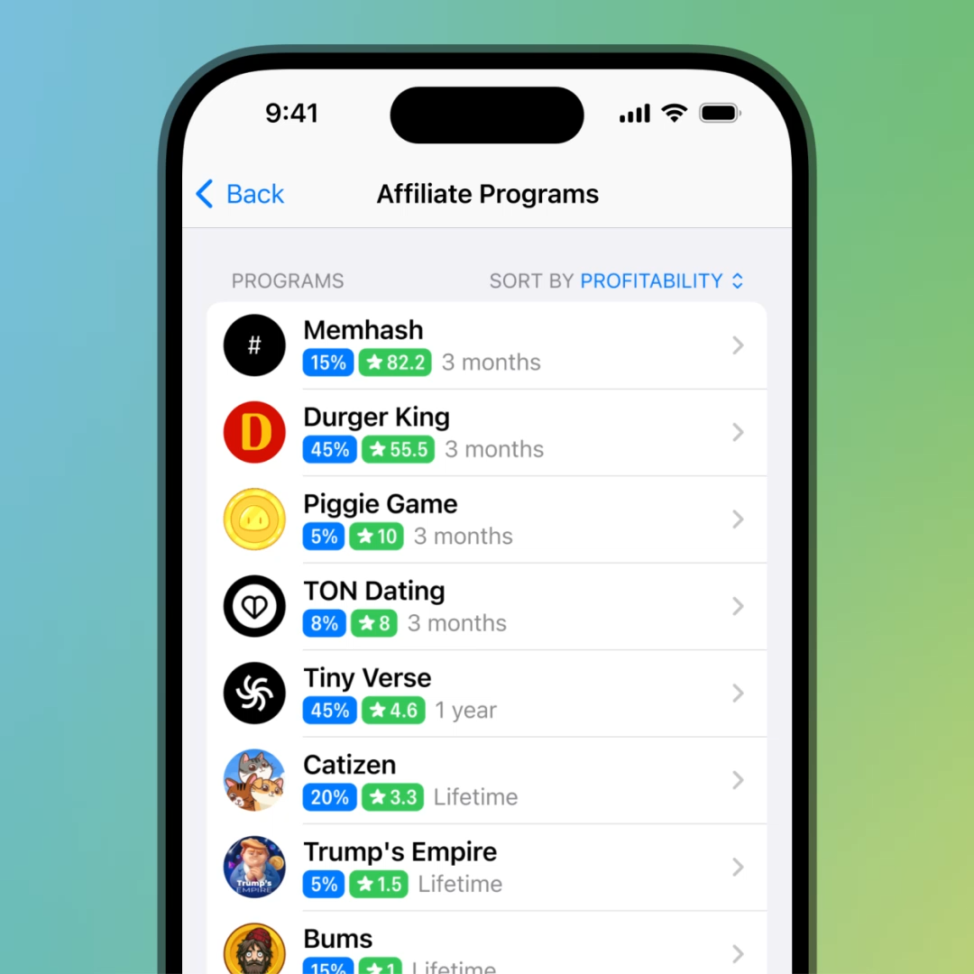 Telegram users are able to browse a list of active affiliate programs from their Star balance in Settings > My Stars. There they can sort programs by their start date, total revenue or potential profit and join any program they wish. There are no limits on the number of programs a user can join.