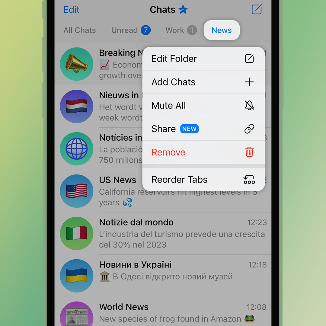 Ещё один пример — папка с новостными каналами на разных языках. В этом случае можно создать отдельные ссылки для чатов на английском и русском языках — или разделить мировые и местные новости.